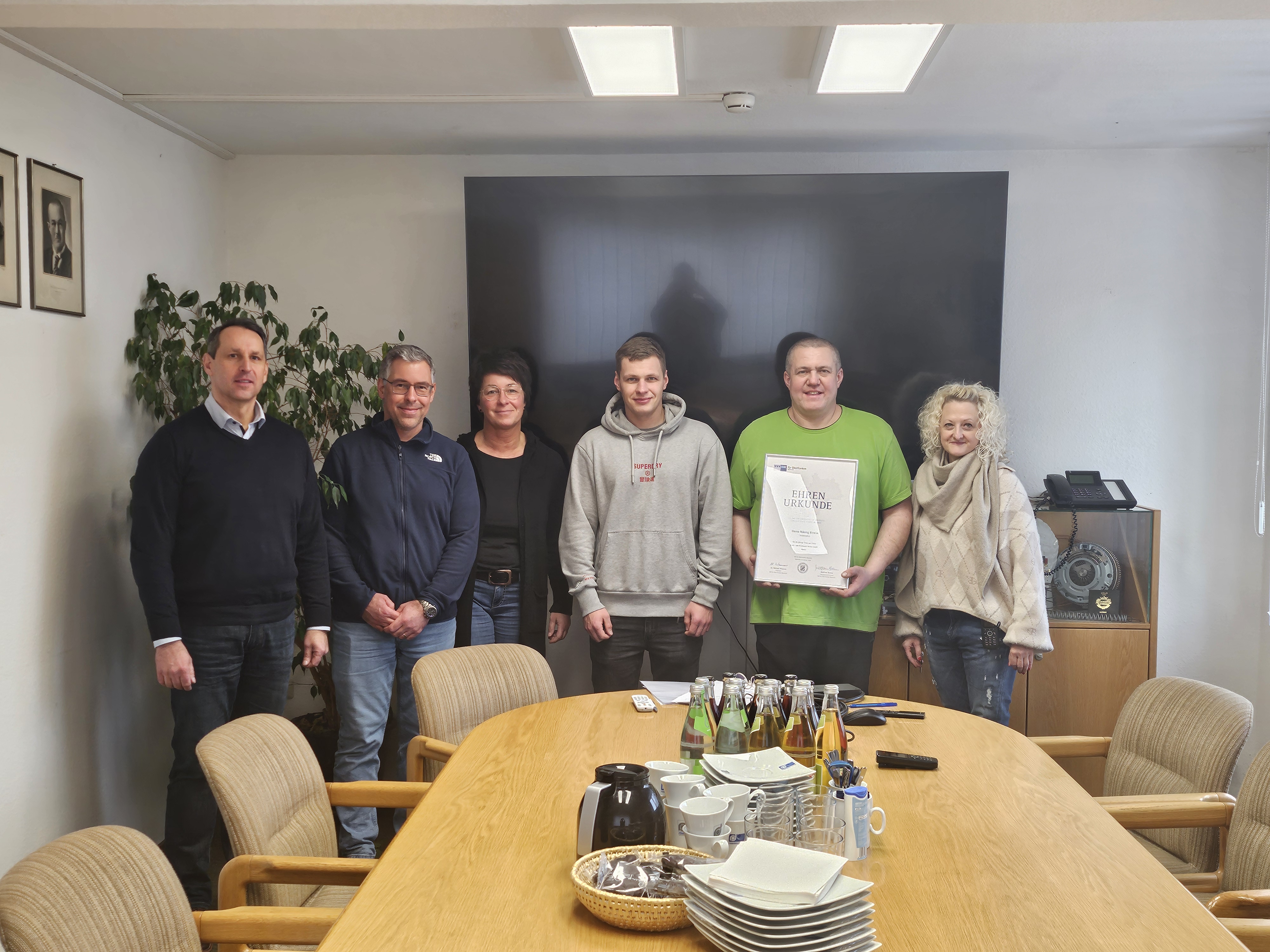 im Bild von links nach rechts: Matthias Tupy (Geschäftsführer), Christoph Betz (Betriebsleiter), Sybille Schneider (HR), Kevin Günter (Abteilungsleiter Drahtzug), Nicolaj Birklin (Jubilar) und Nadine Anger (Betriebsratsvorsitzende)